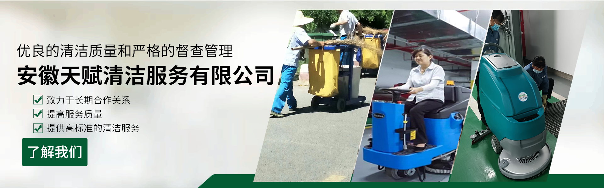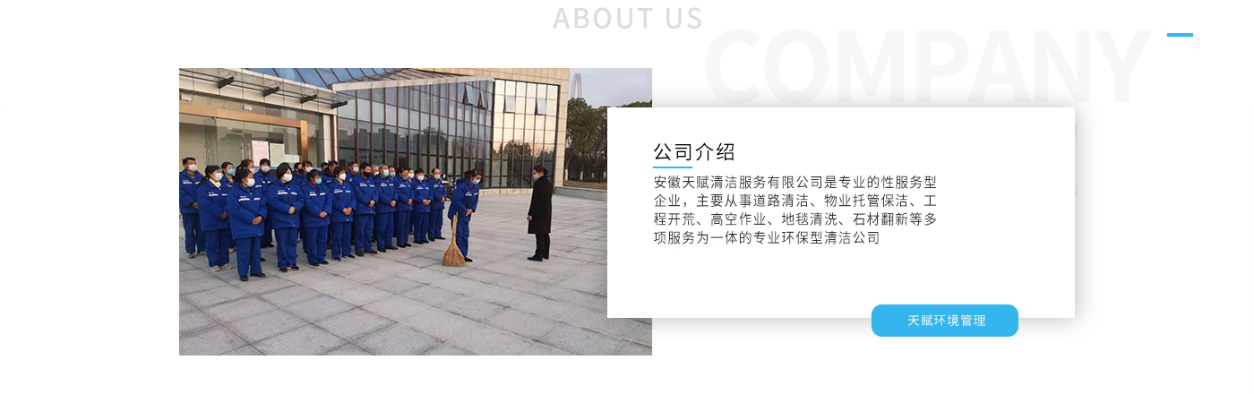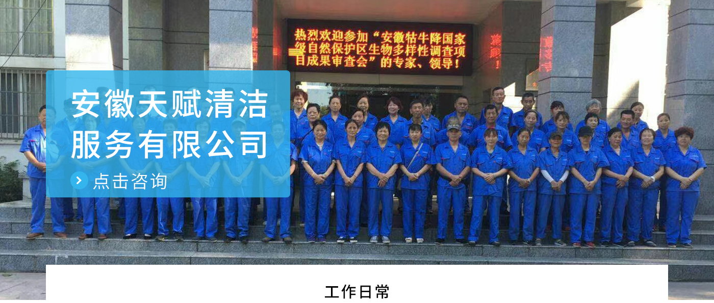 安徽天賦清潔服務(wù)有限公司是的服務(wù)型企業(yè),主要從事道路清潔、物業(yè)托管保潔、工程開(kāi)荒、高空作業(yè)、地毯清洗、石材翻新等多項(xiàng)服務(wù)為一體的環(huán)保型清潔公司。公司管理機(jī)制完善,清潔作業(yè)經(jīng)驗(yàn)豐富,擁有技術(shù)力量,嚴(yán)格實(shí)行崗前培訓(xùn)—崗中督查—上崗在培訓(xùn)的員工管理措施,憑著優(yōu)良的清潔質(zhì)量和嚴(yán)格的督查管理,為眾多企事業(yè)單位、醫(yī)院、酒店、廠區(qū)商場(chǎng)、物業(yè)、道路、學(xué)校、公園等提供后勤清潔服務(wù)。在業(yè)內(nèi)擁有良好的口碑。工作人員,服務(wù)態(tài)度優(yōu),竭力為客戶提供好的保潔服務(wù)。安徽天賦清潔服務(wù)有限公司:致力于長(zhǎng)期合作關(guān)系,提高服務(wù)質(zhì)量,提供高標(biāo)準(zhǔn)的清潔服務(wù)。公司的經(jīng)營(yíng)理念:為營(yíng)造一個(gè)更清潔、亮麗的生活和工作環(huán)境而努力!“誠(chéng)信”是公司成功保證?!翱蛻糁辽?,信譽(yù)為首”是公司宗旨。高標(biāo)準(zhǔn)提供服務(wù),維護(hù)客戶利益、形象,是我始終不渝的目標(biāo)。
